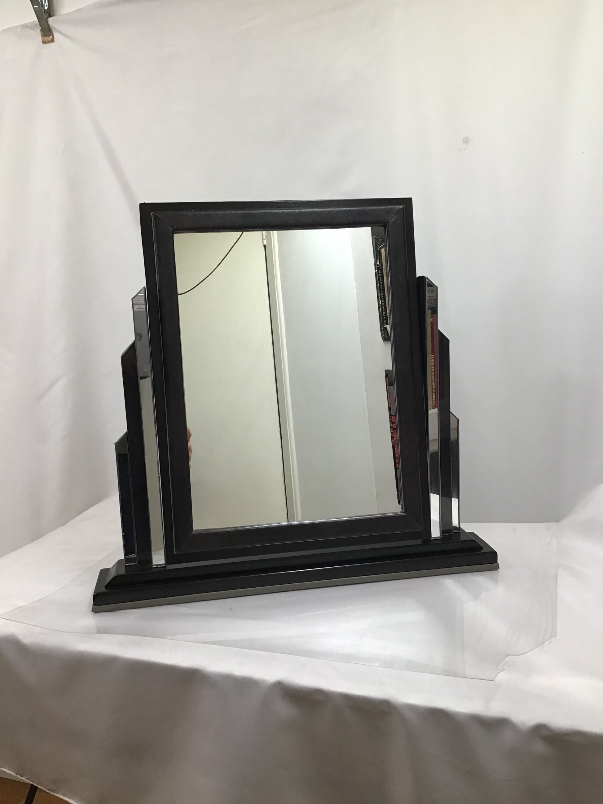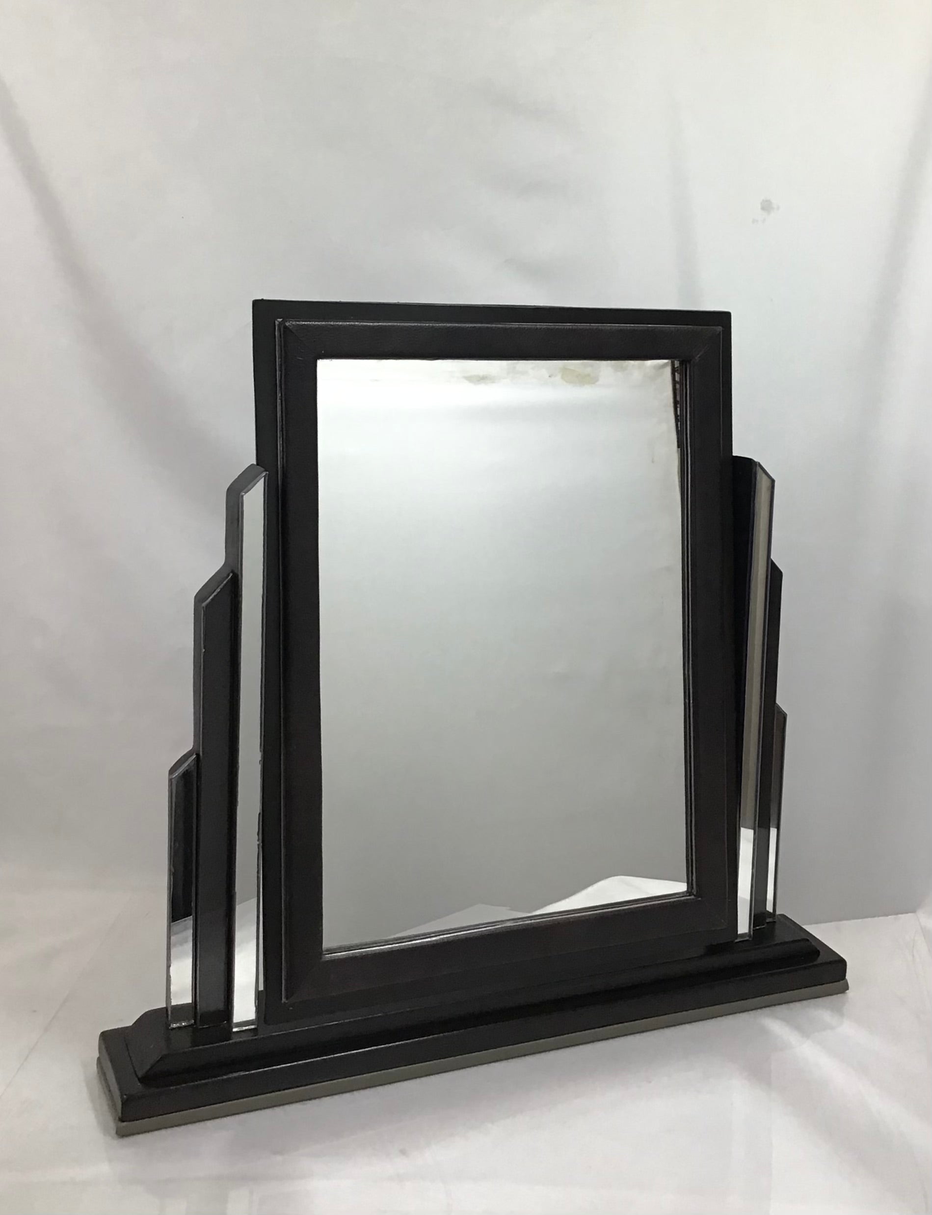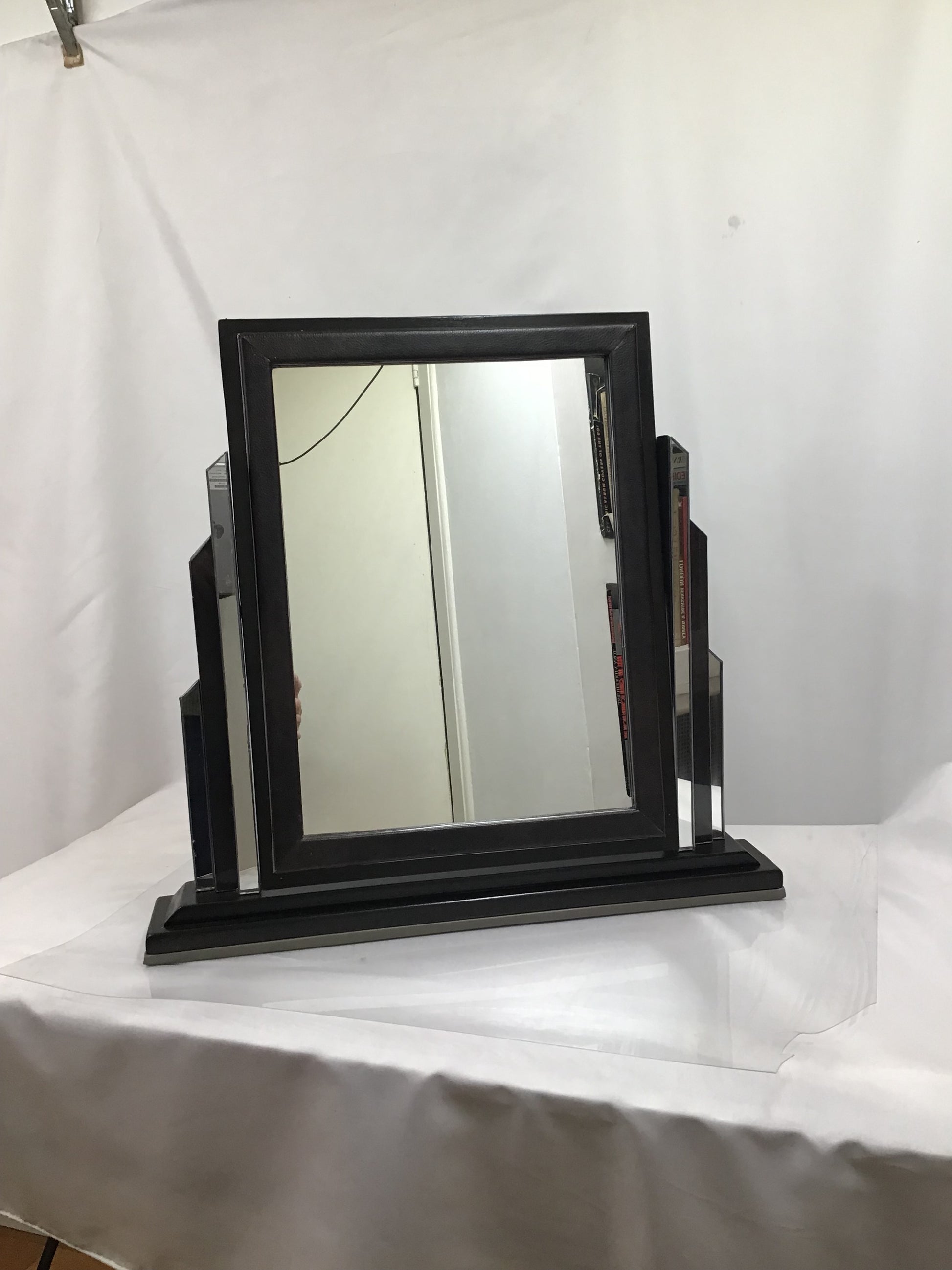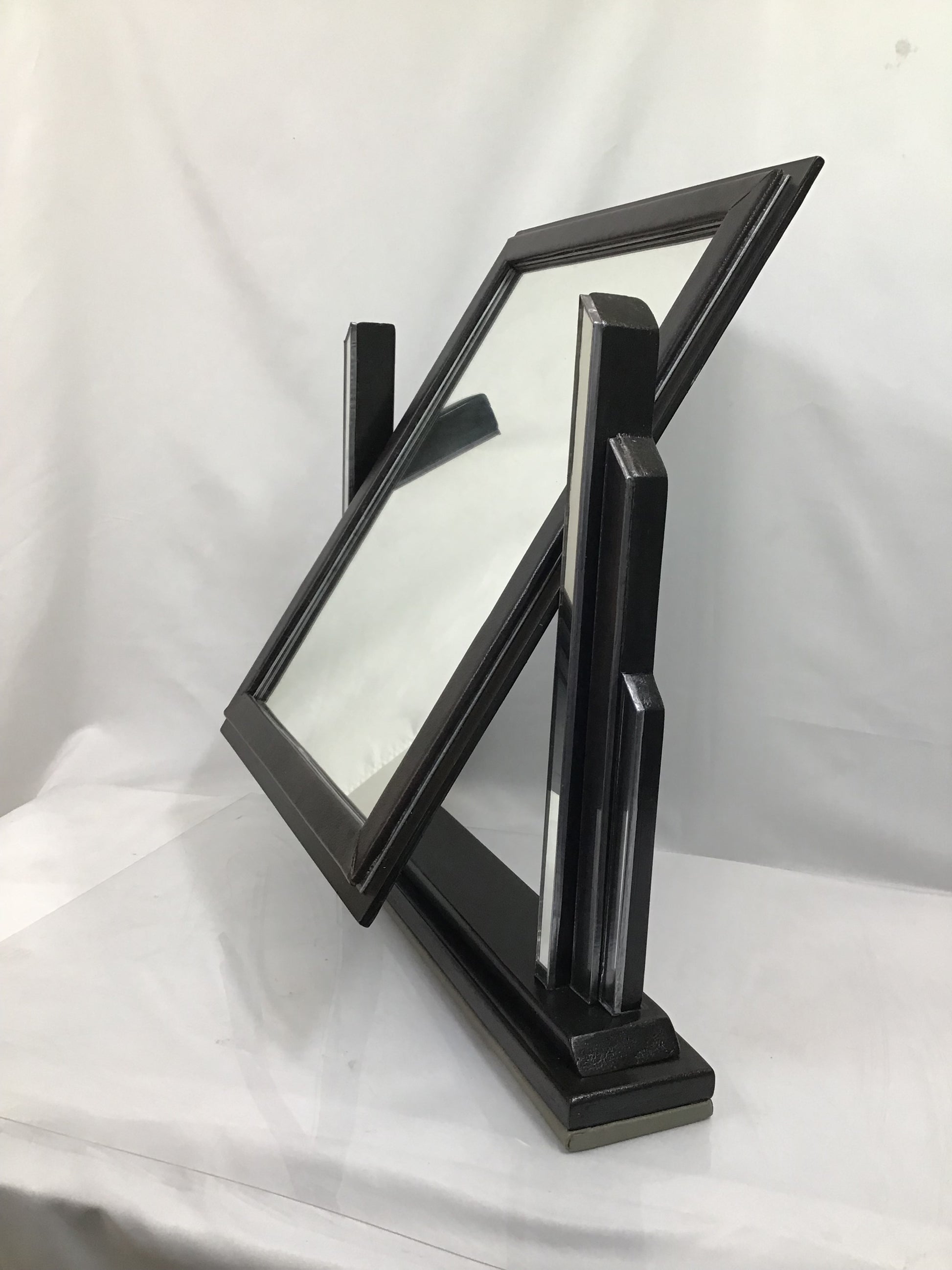 Large Art Deco Pivoting Dressing Vanity Mirror. Handmade from 100% salaged and then recycled materials, the designs is based on an original 1920’s Art Deco Mirror. A rectangular wooden mirror on a wooden dark varnished base. The mirror is supported either side by glass Art Deco style columns and the tilting mirror has a matching faux leather border. The freestanding mirror has faux leather on the base to give a soft surface. A one off original and an authentic looking piece makes a perfect gift for admirers of Art Deco.