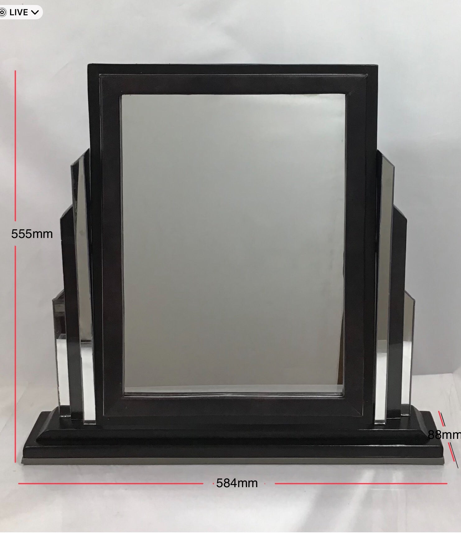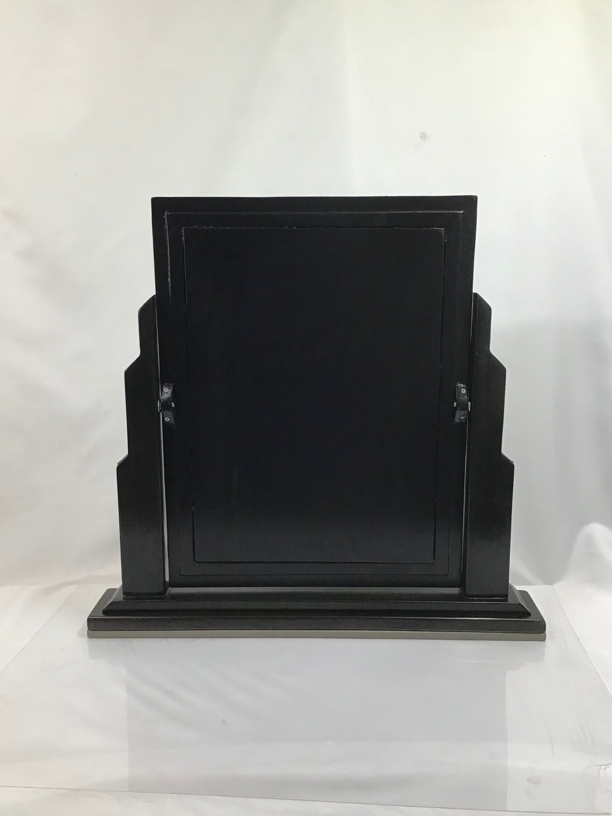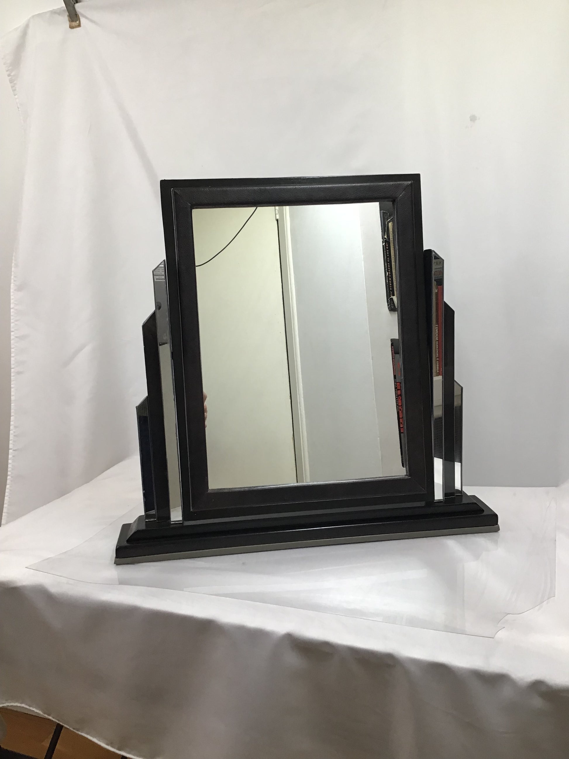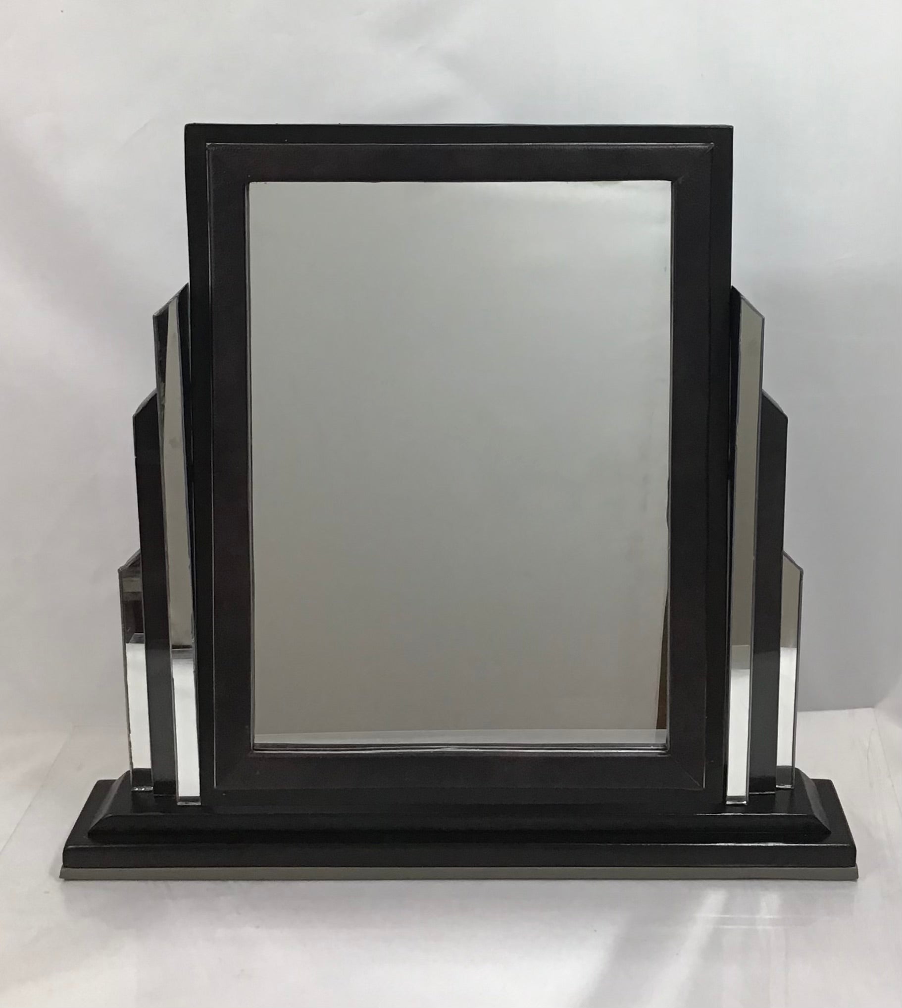 Large Art Deco Pivoting Dressing Vanity Mirror. Handmade from 100% salaged and then recycled materials, the designs is based on an original 1920’s Art Deco Mirror. A rectangular wooden mirror on a wooden dark varnished base. The mirror is supported either side by glass Art Deco style columns and the tilting mirror has a matching faux leather border. The freestanding mirror has faux leather on the base to give a soft surface. A one off original and an authentic looking piece makes a perfect gift for admirers of Art Deco.