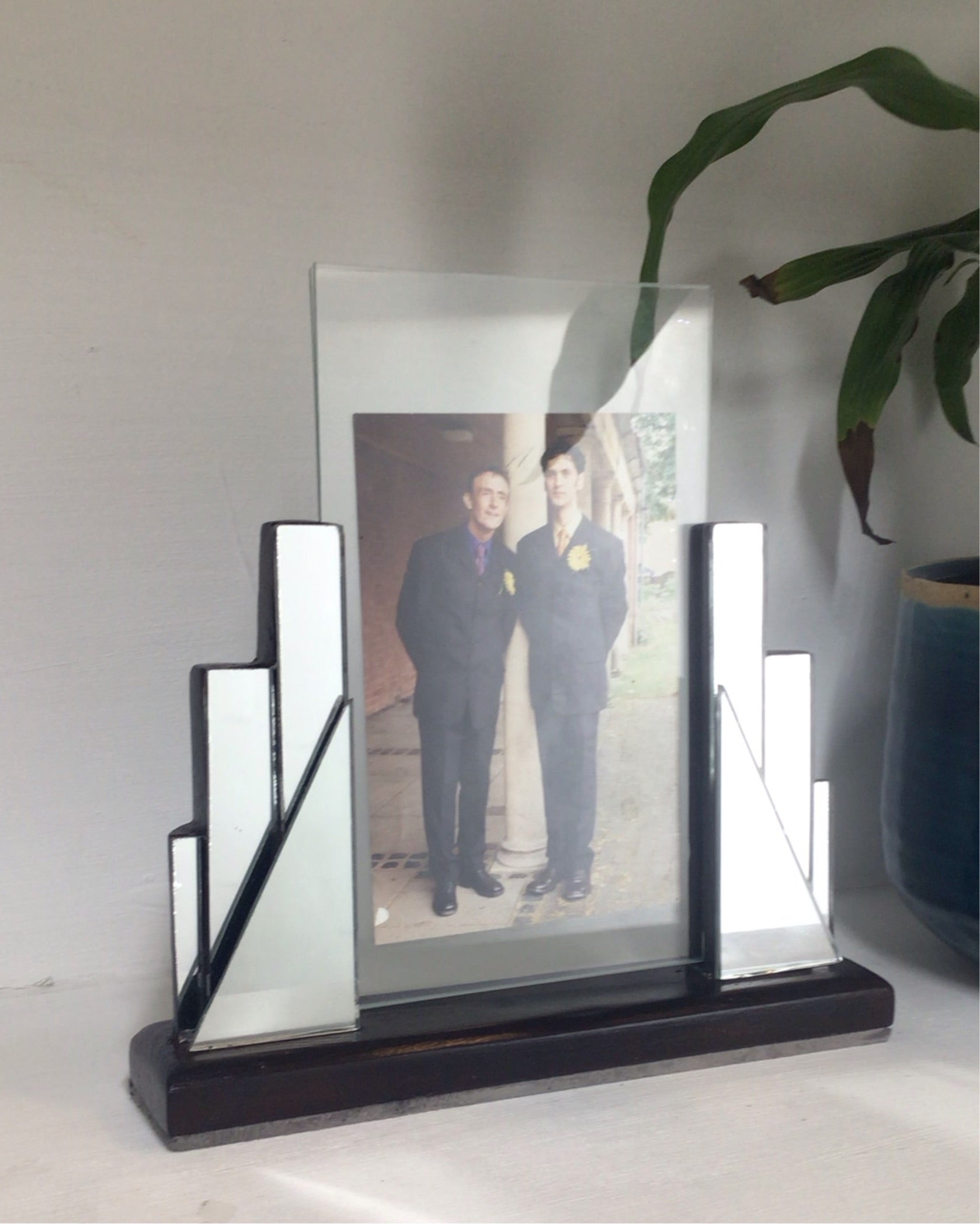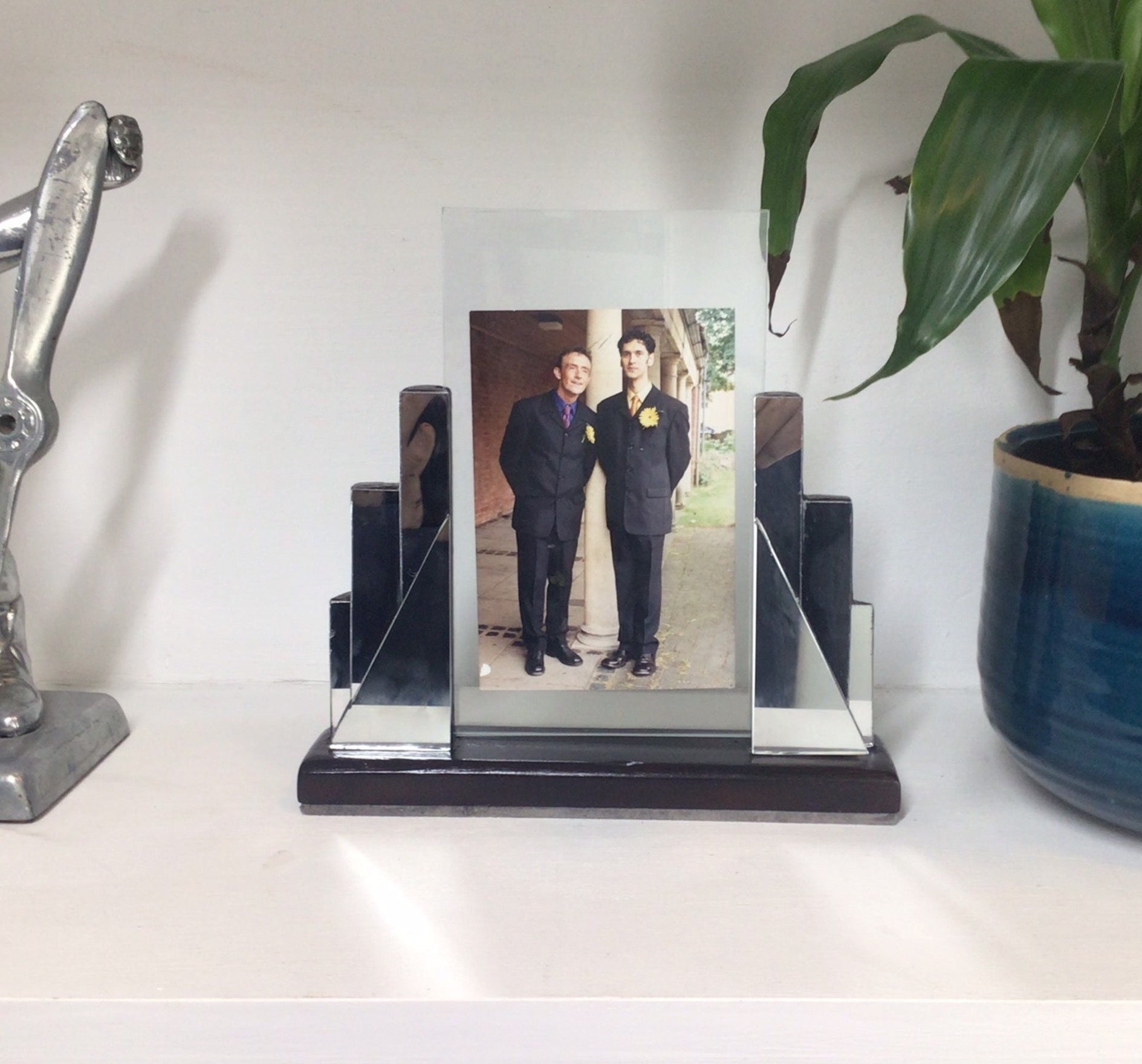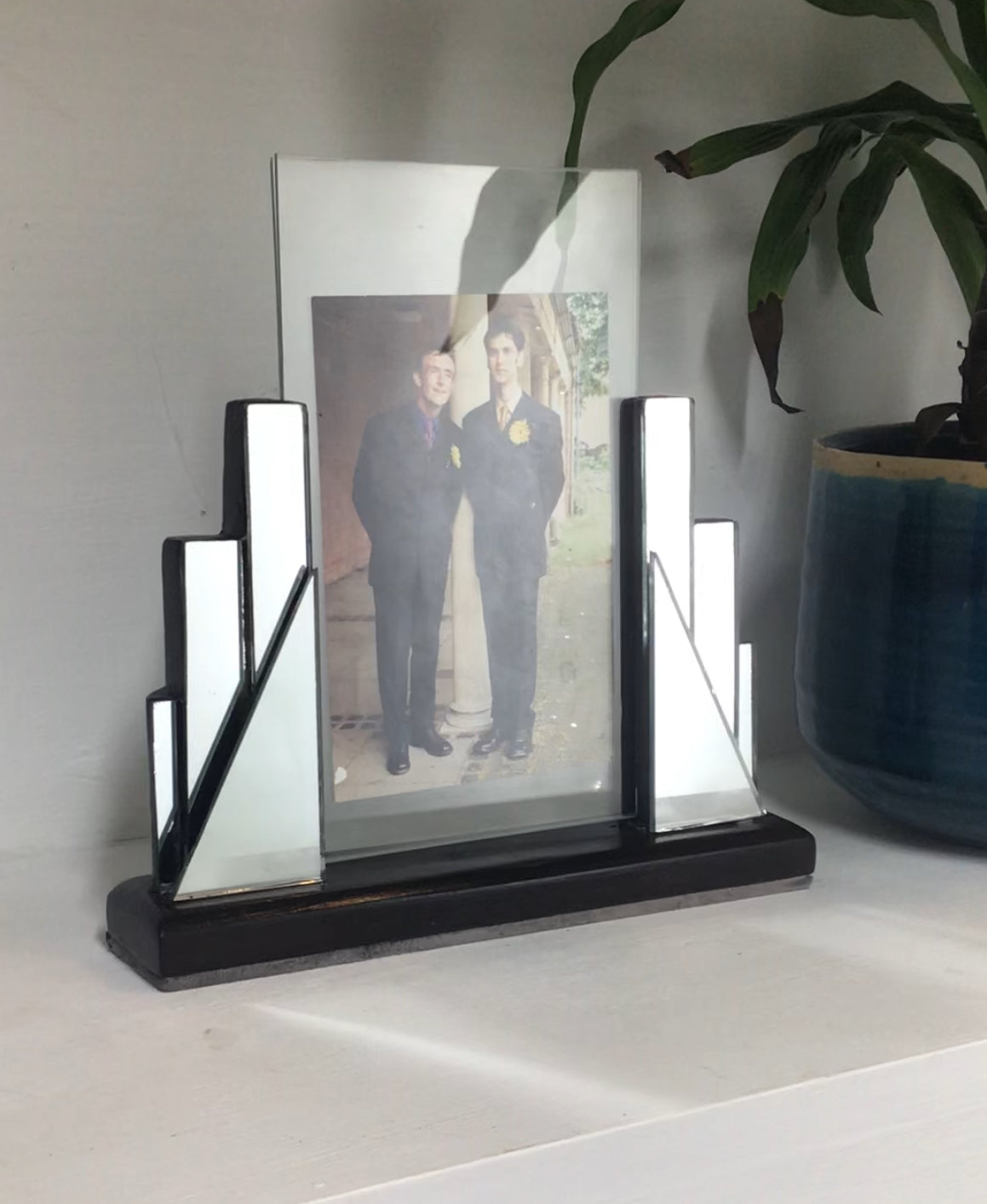 Handmade from 100% recycled materials to an original Art Deco design from the 1930’s. Two glass sheets hold the photograph on a varnished dark wood base fronted with mirror in a pattern typical of the Art Deco period. Silver velvet cushions the base bottom. It would make an ideal Wedding or Silver Wedding Anniversary gift. The frame fits a standard 4x6 inch photograph