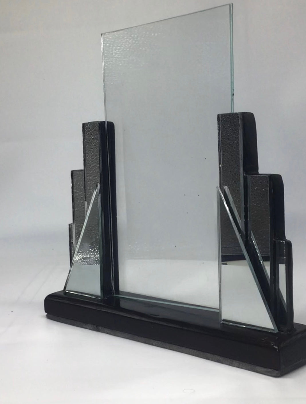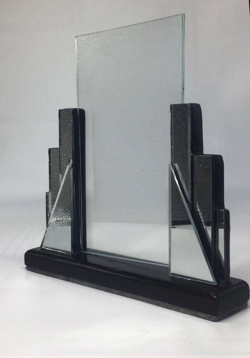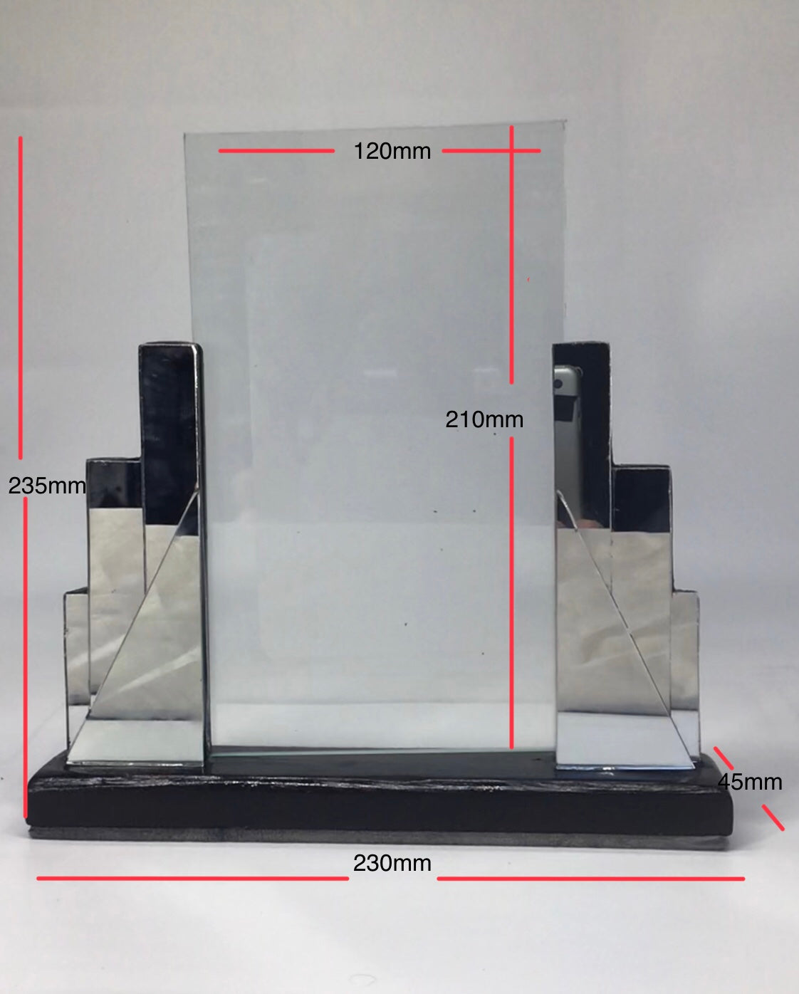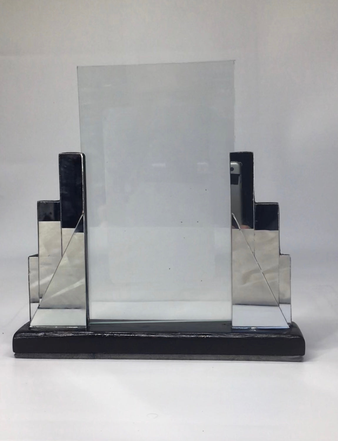 Handmade from 100% recycled materials to an original Art Deco design from the 1930’s. Two glass sheets hold the photograph on a varnished dark wood base fronted with mirror in a pattern typical of the Art Deco period. Silver velvet cushions the base bottom. It would make an ideal Wedding or Silver Wedding Anniversary gift. The frame fits a standard 4x6 inch photograph